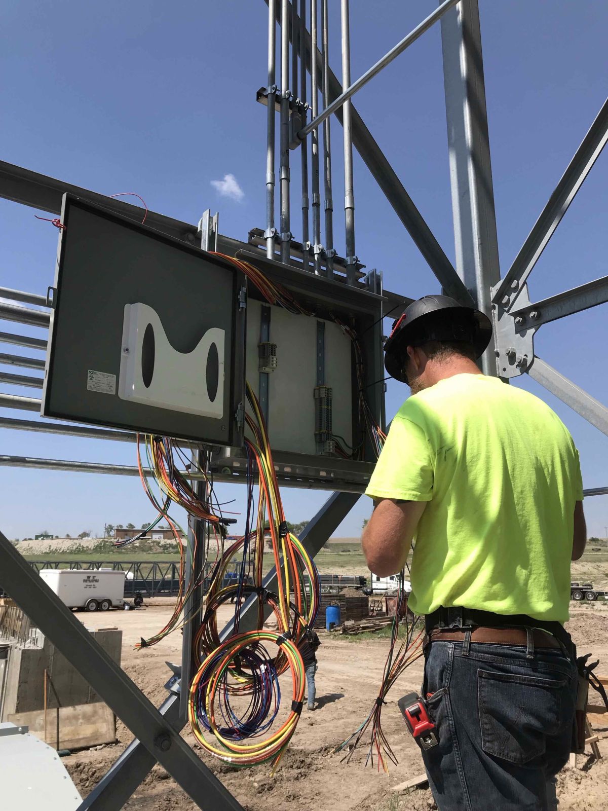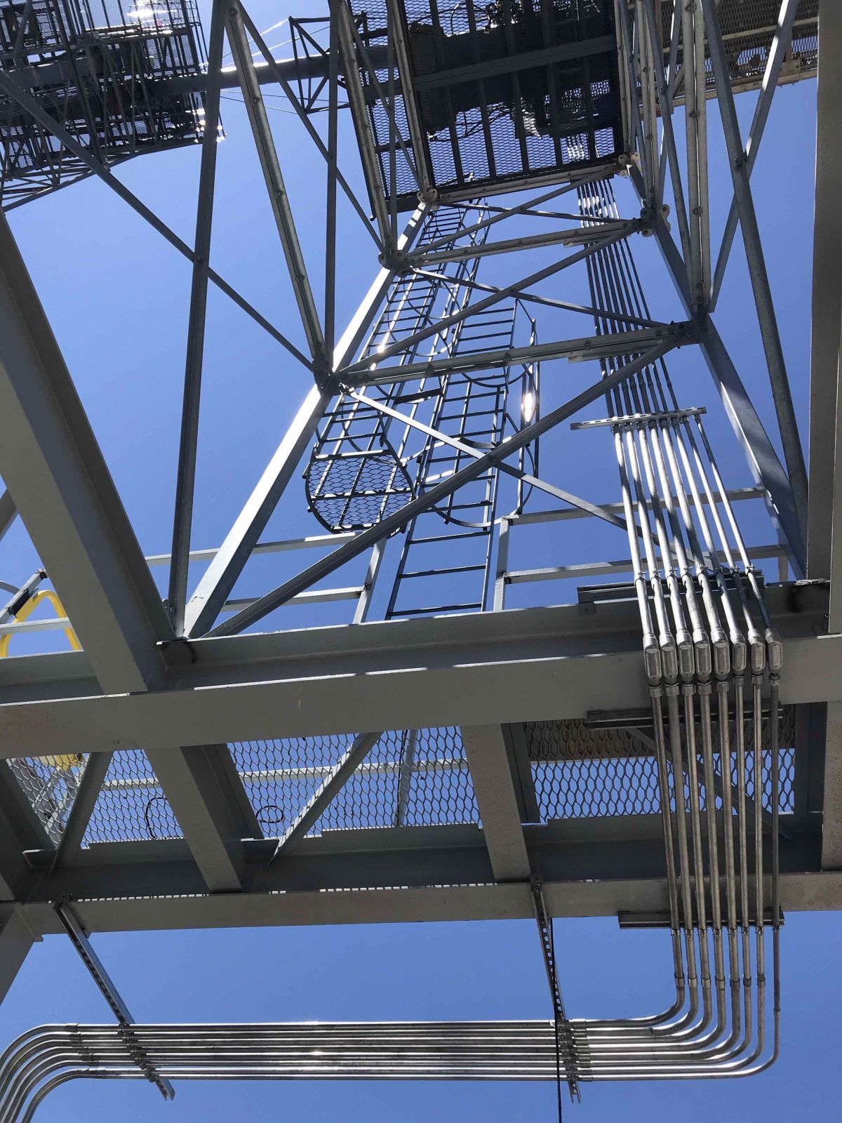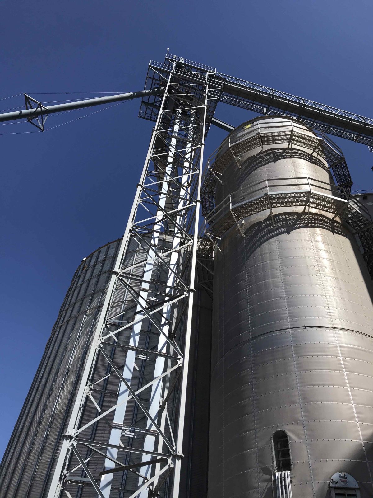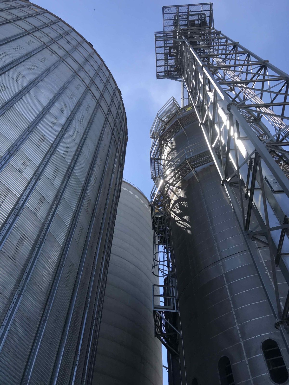 Working at heights of more than 50′ presented a challenge in regards of logistics as well as safety. A robust safety plan was implemented which included purchasing of repelling gear for running pipe down the top of the 156′ grain bin. There were also areas that were not accessible by a boom lift, so the employees used the repelling gear to run conduit down the grain tower.